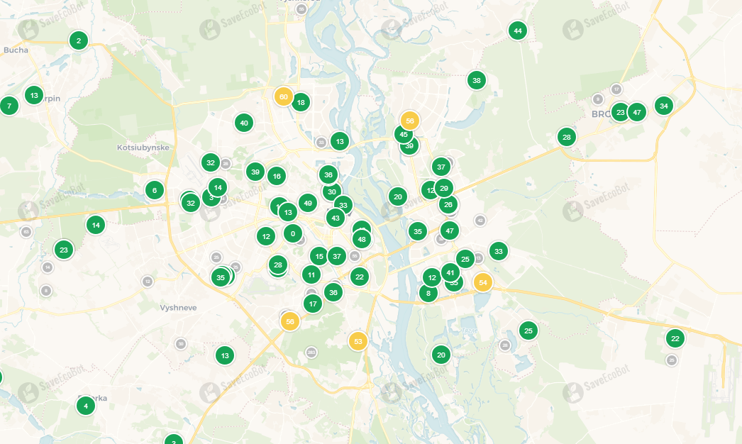 В Киеве воздух почти полностью чистый. Несколько небольших желтых превышений почти не влияют на общую картину. Дышать будет комфортно даже людям с повышенной чувствительностью.