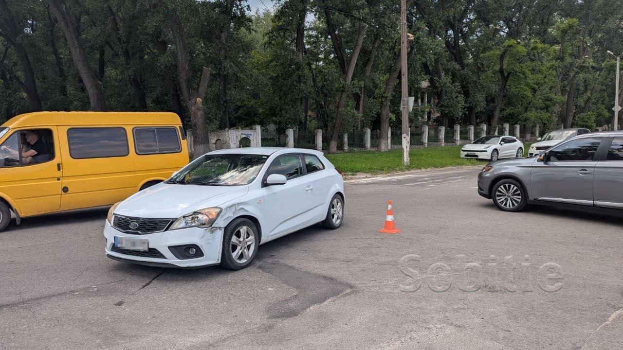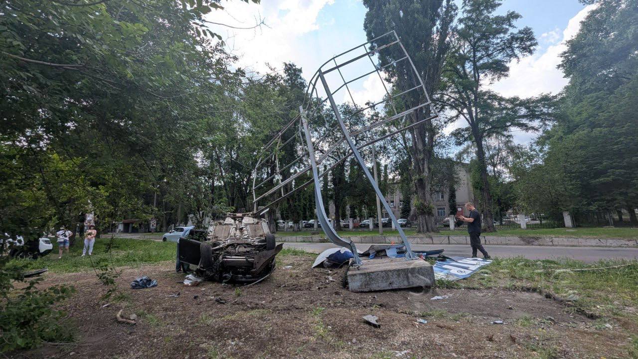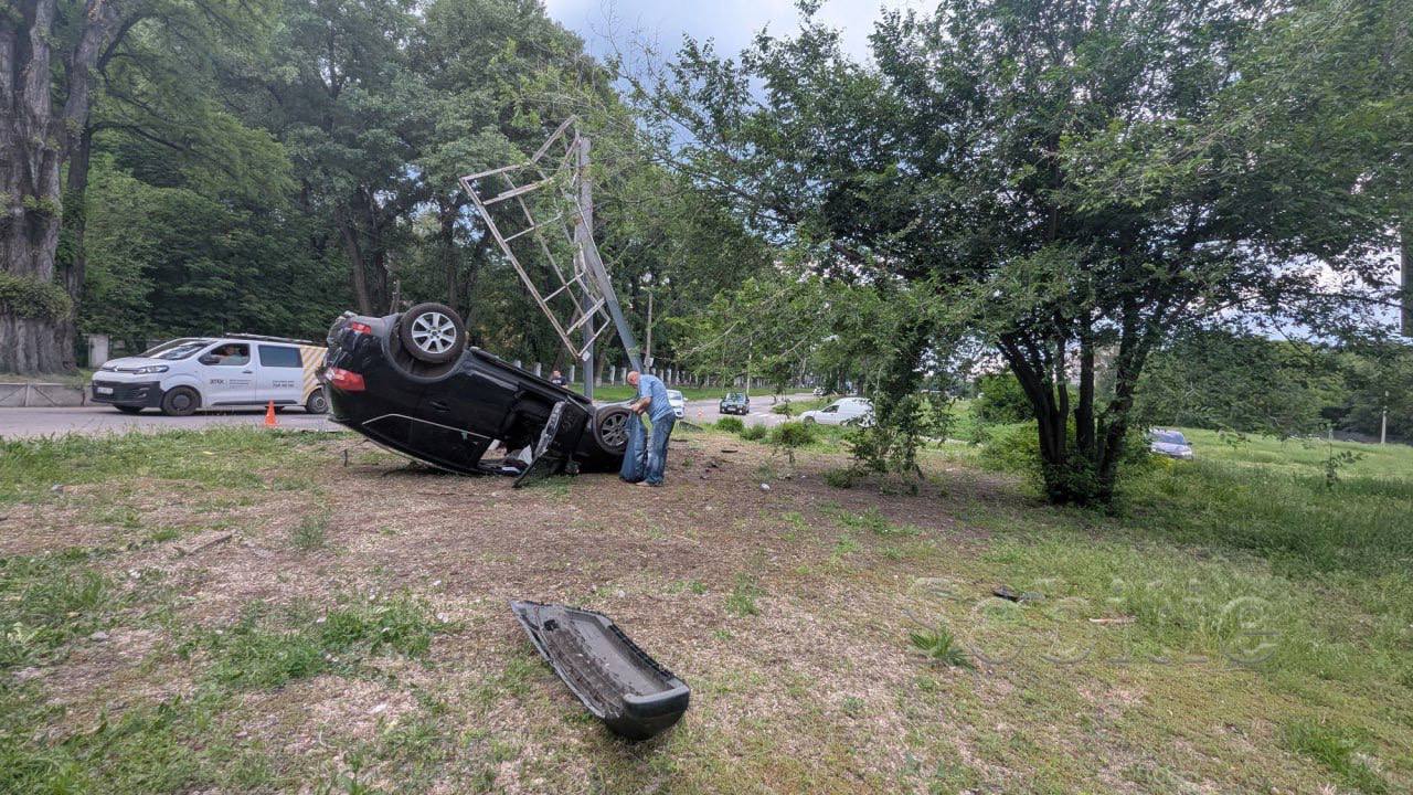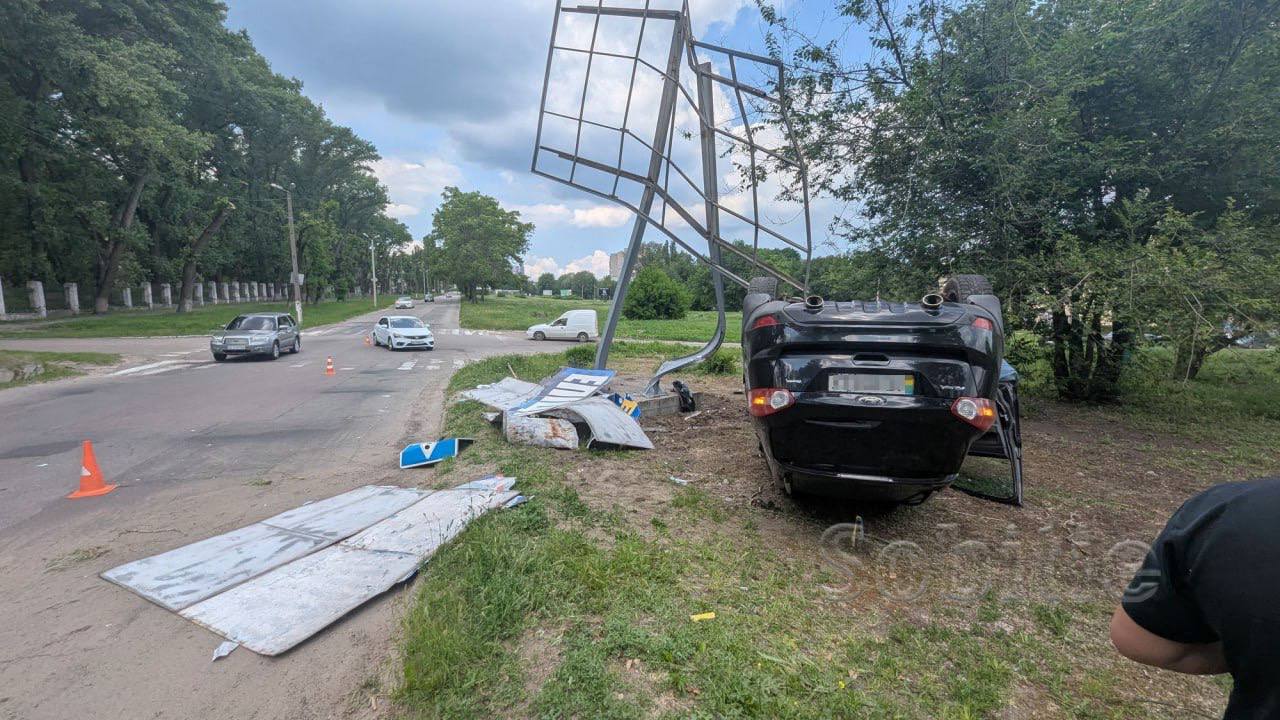 На проспекте Аношкина в Каменском произошло ДТП. Водитель автомобиля Ford Kuga, пытаясь избежать столкновения с белой KIA, которая начала поворот без сигнала, врезался в рекламный щит и перевернулся на крышу.