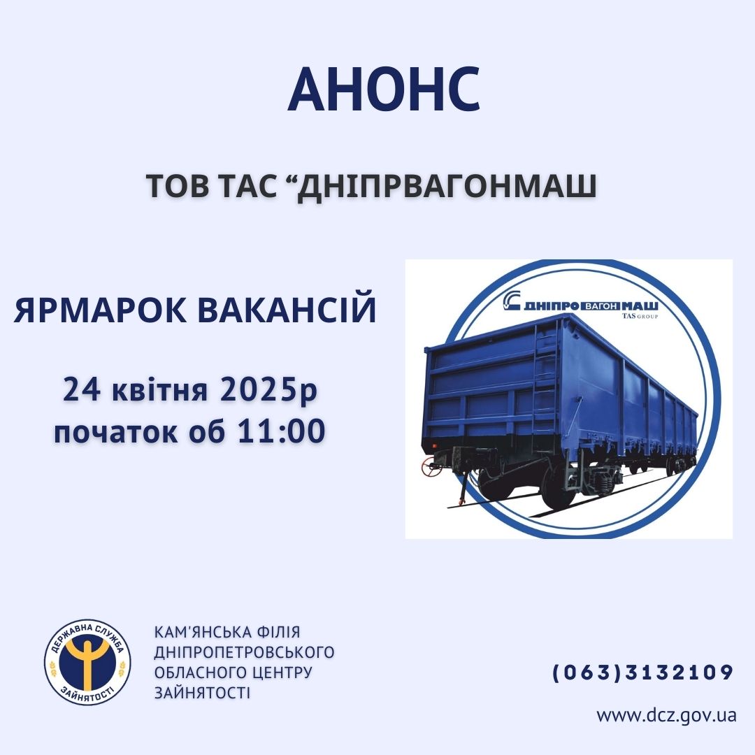 24 апреля 2025 года в Каменском филиале Днепропетровского областного центра занятости состоится ярмарка вакансий для ООО "ТАС ДНІПРОВАГОНМАШ".