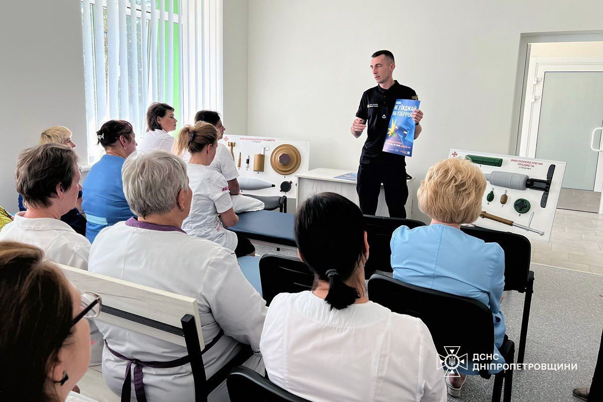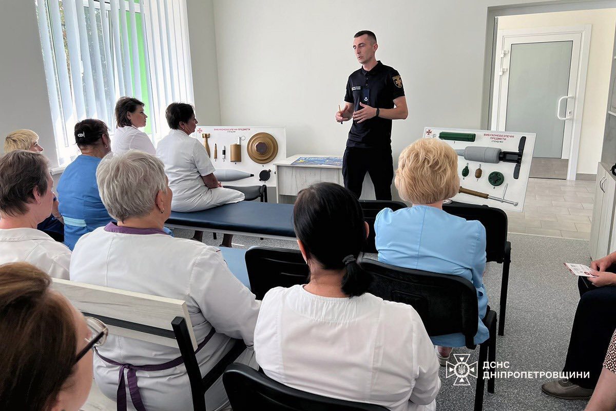 Офицер-спасатель Каменской общины в учреждении здравоохранения для медицинских работников Каменского провел лекцию на тему рисков, связанных со взрывоопасными предметами.