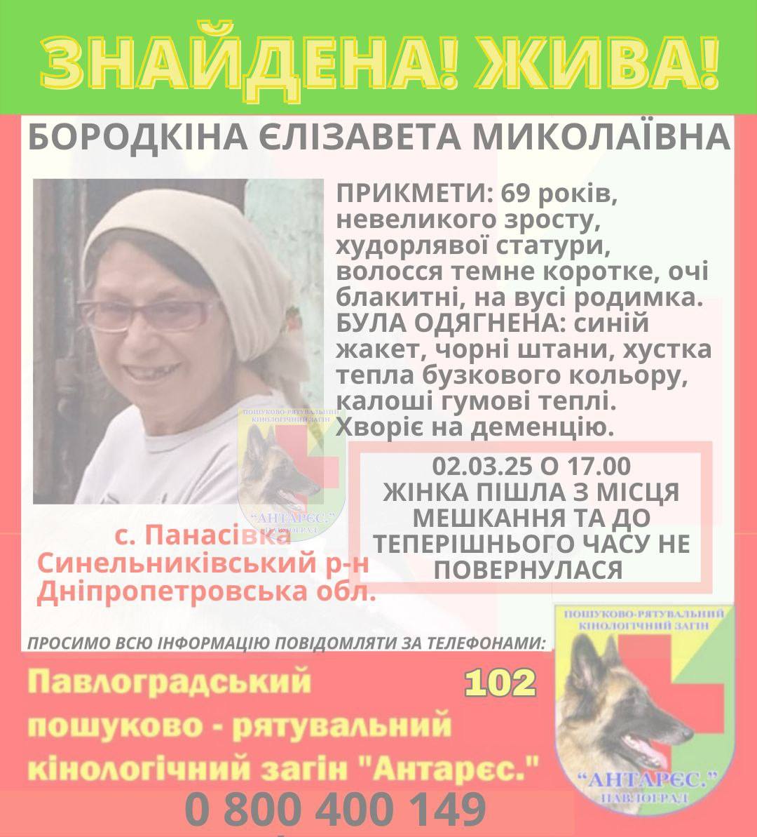 В Синельниковском районе обнаружили бабушку Бородкину Елизавету Николаевну, которая считалась пропавшей без вести в течение 12 часов. Женщина провела всю ночь на заснеженном поле, но выжила. Об этом сообщила руководитель Павлоградского поисково-спасательного кинологического отряда "Антарес" Лариса Борисенко.