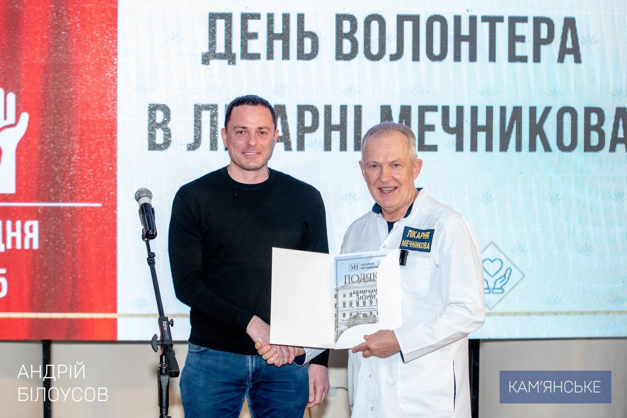 Город Каменское поддерживает больницу имени Мечникова и активно сотрудничает с волонтёрскими организациями. Наша волонтёрская община остаётся одной из самых активных в регионе, ежедневно присоединяясь к обеспечению военных и помощи людям. Для меня стало честью получить благодарность по случаю Дня волонтёра от генерального директора больницы Сергея Рыженко. Это важная оценка нашей работы и дальнейшего сотрудничества с медучреждением. Желаю всем сил и выдержки. Работаем ради Победы", — сказал городской голова Андрей Белоусов.