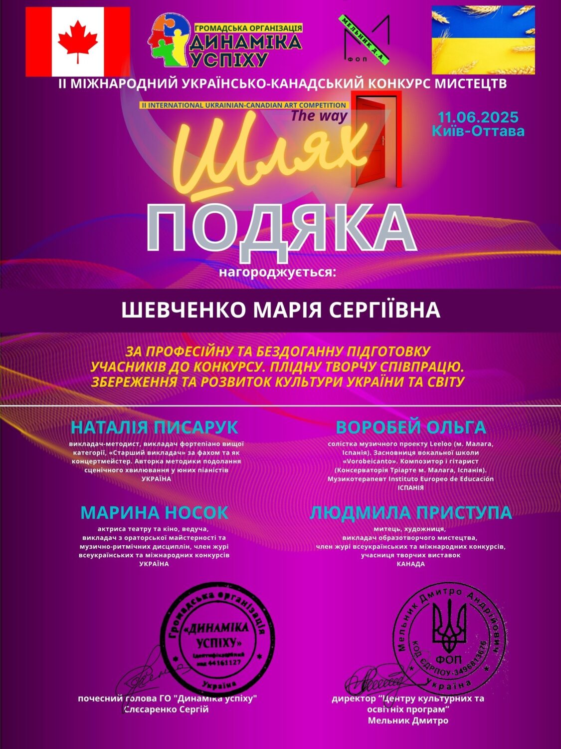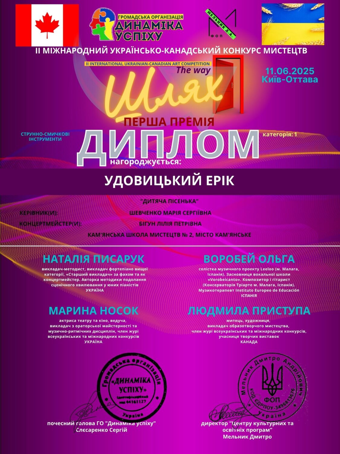 Поздравляем с победой юных воспитанников Каменской школы искусств №2 с победой во II Международном Украинско-Канадском конкурса искусств "ШЛЯХ"!