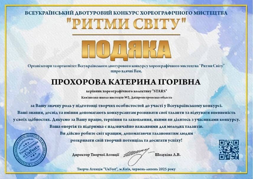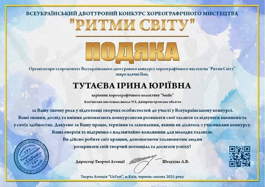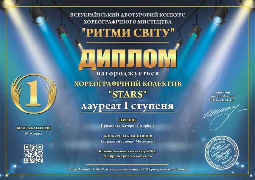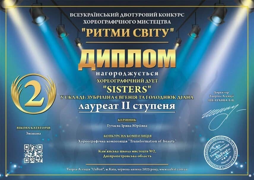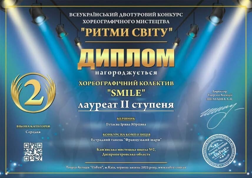 В июле 2025 года в Киеве проходил Всеукраинский двухтуровый конкурс хореографического искусства "Ритмы мира", организованный Творческим агентством "UaFest". В нем выступили ученики хореографического отделения Каменской школы искусств №2.