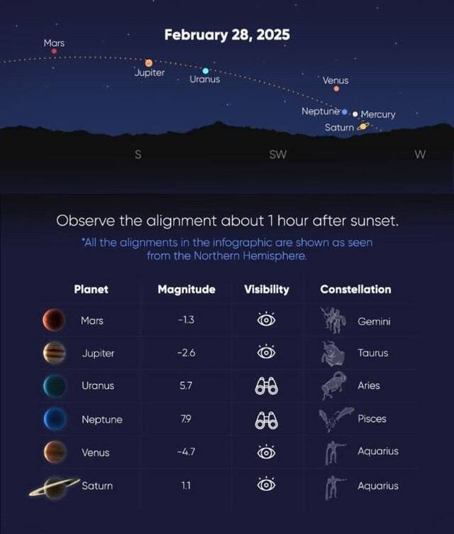 Вечером 28 февраля 2025 года на небе можно будет наблюдать "большой парад планет", во время которого 7 планет Солнечной системы: Сатурн, Меркурий, Нептун, Венера, Уран, Юпитер и Марс одновременно появятся на небосклоне. В следующий раз подобное явление произойдет только в 2161 году.