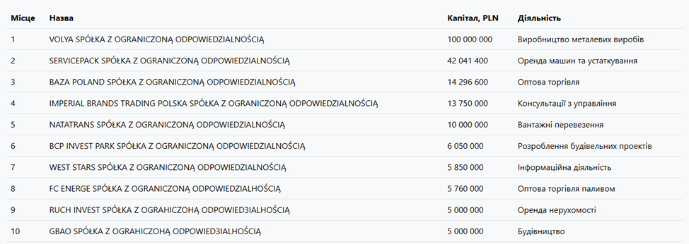 Топ-10 украинских компаний в Польше по капиталу (открыты после 2022 года)