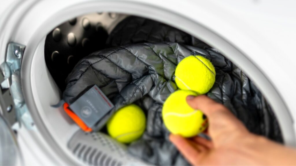 - Добавьте в барабан мячики для стирки или теннисные мячи, чтобы предотвратить слипание пуха;