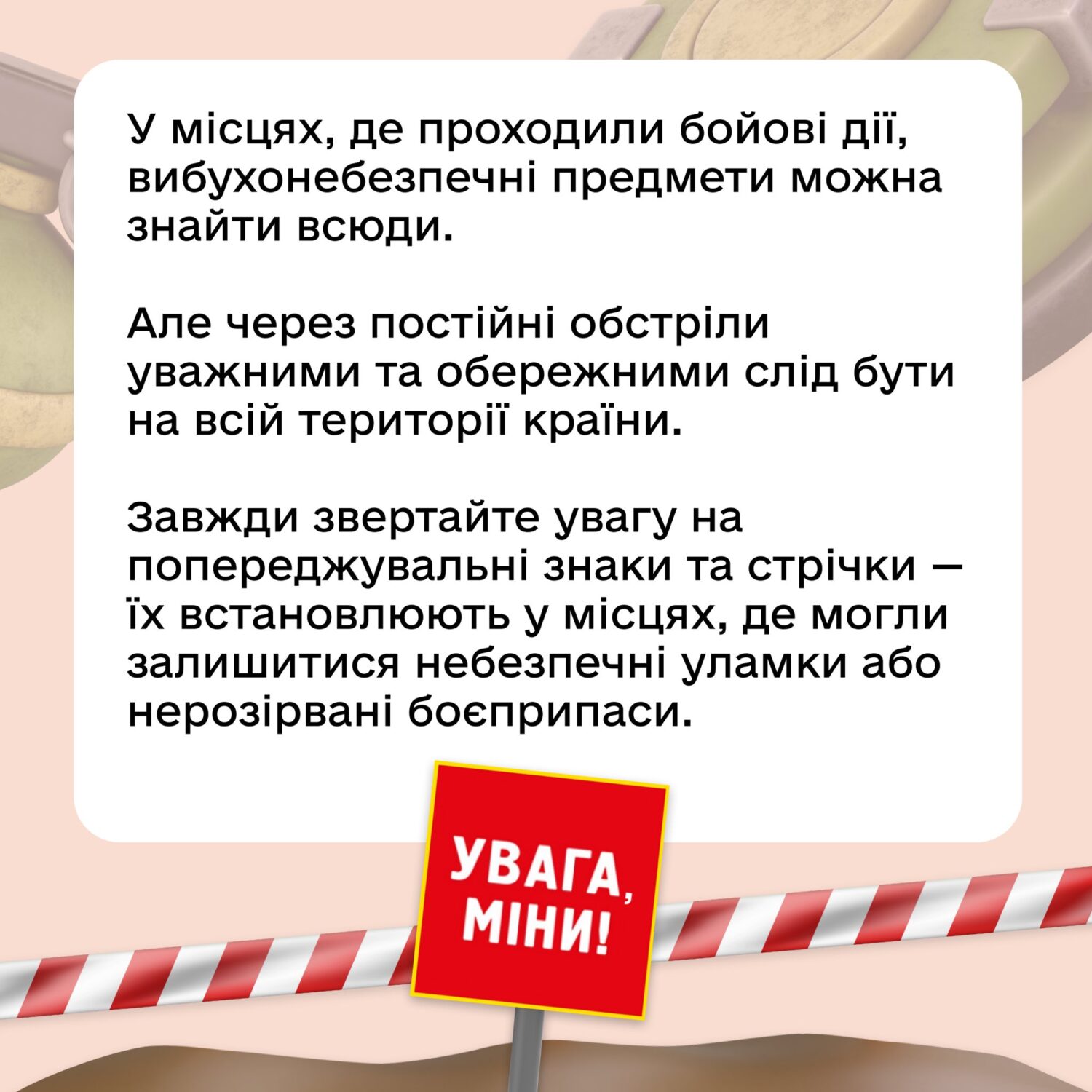 В местах, где велись боевые действия, взрывоопасные предметы могут находиться где угодно. Но из-за постоянных обстрелов бдительность и осторожность нужны по всей территории страны. Всегда обращайте внимание на предупреждающие знаки и ленты — их размещают там, где могут быть опасные осколки или неразорвавшиеся боеприпасы.