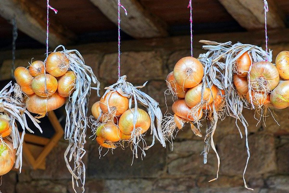 - Лук можно завязать за ботву и подвесить – это поможет с циркуляцией воздуха.