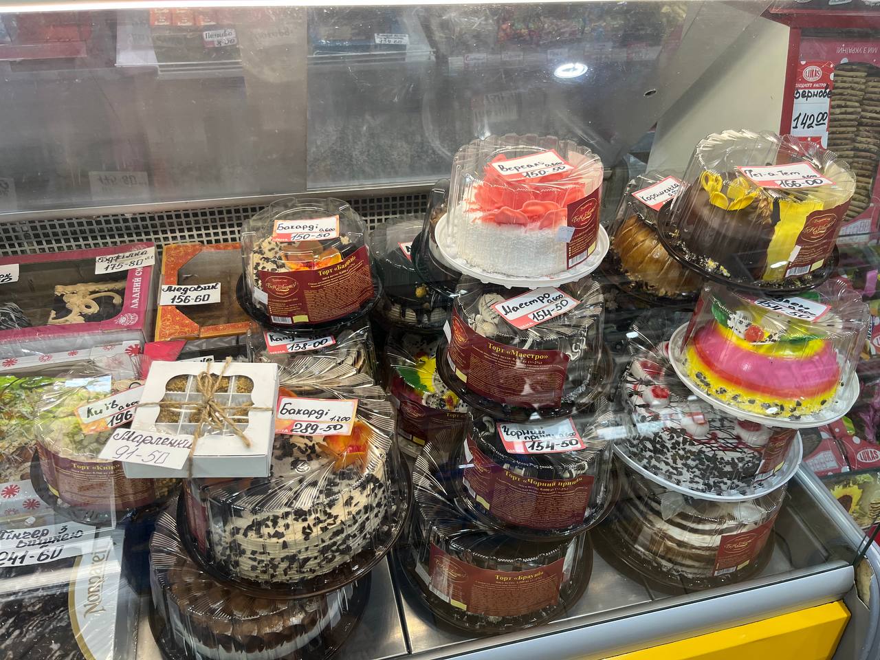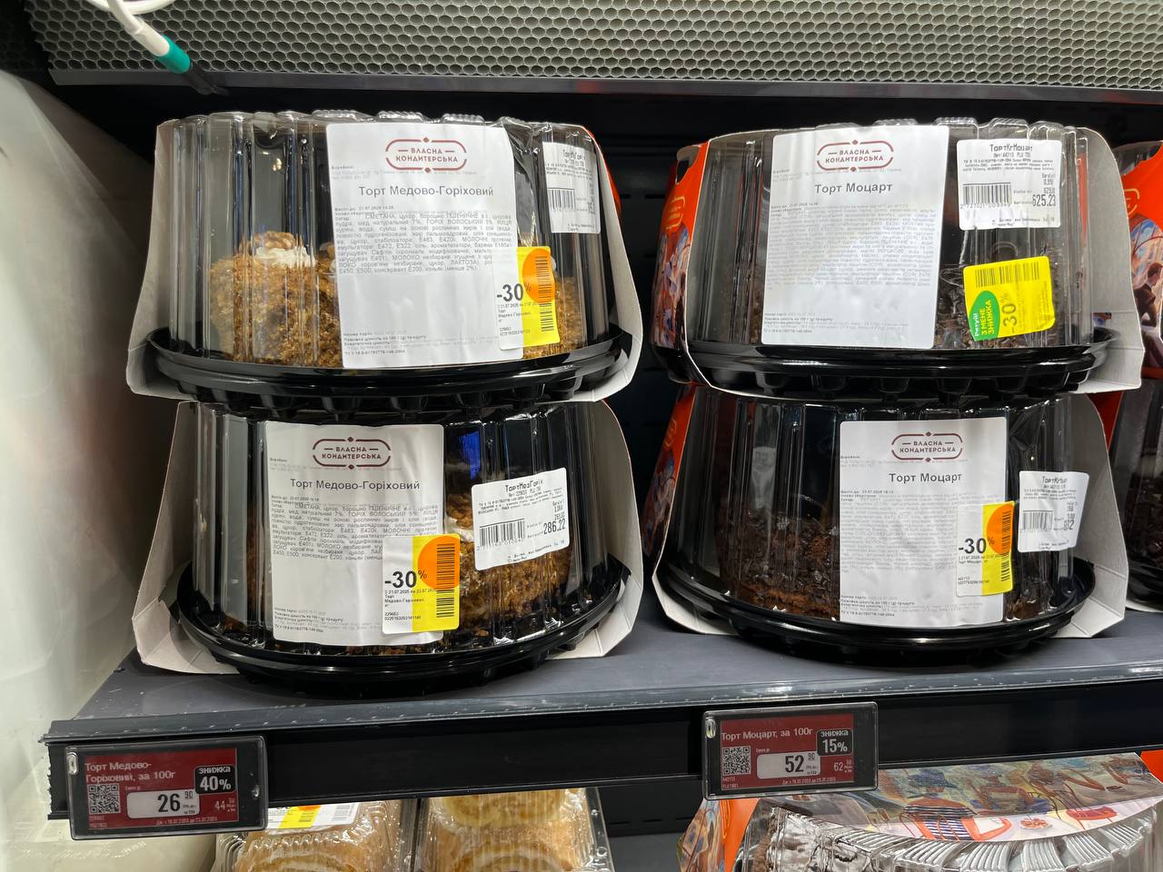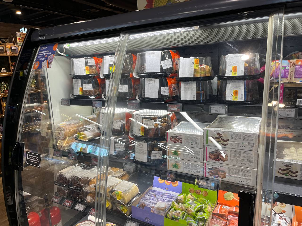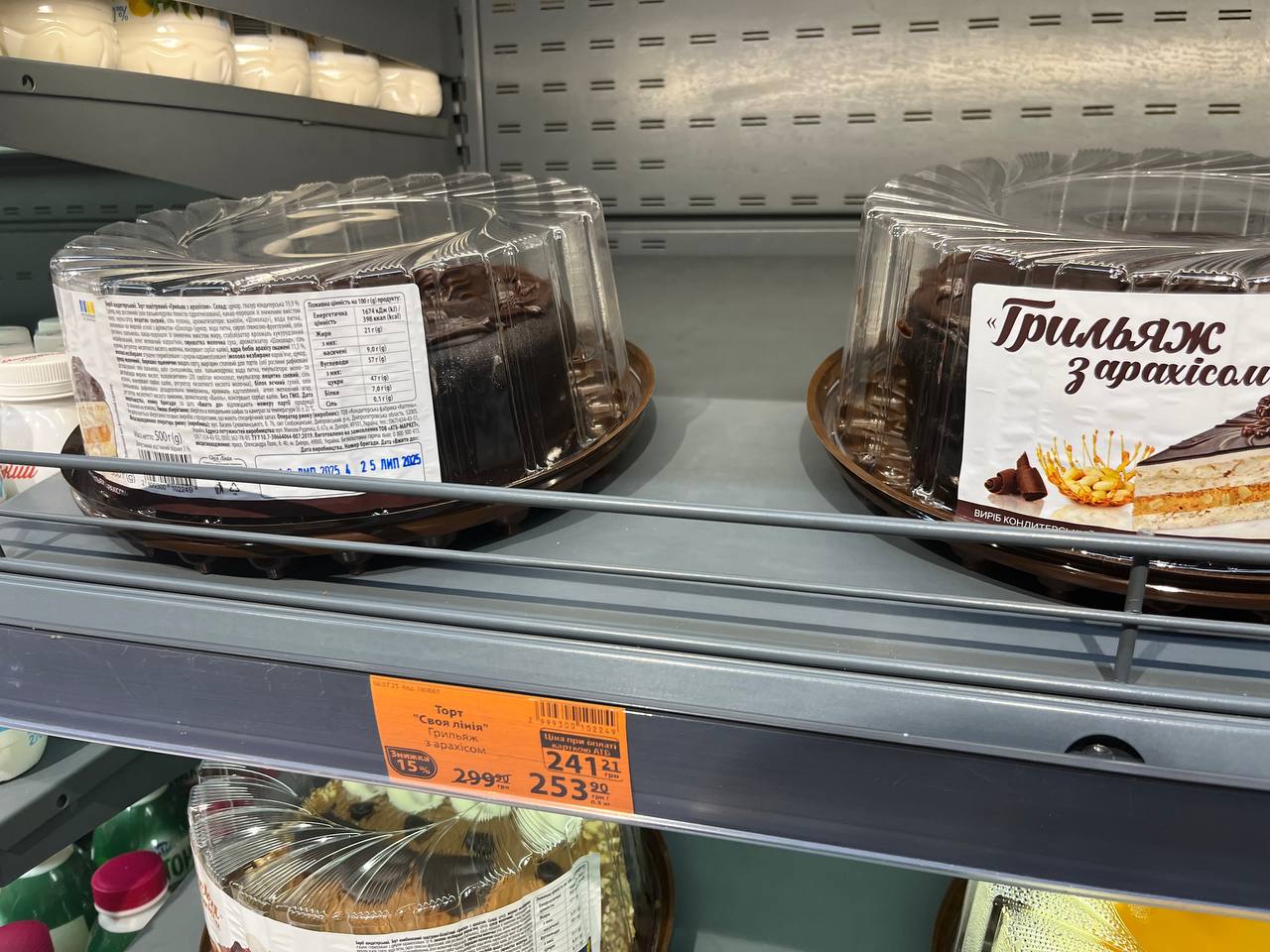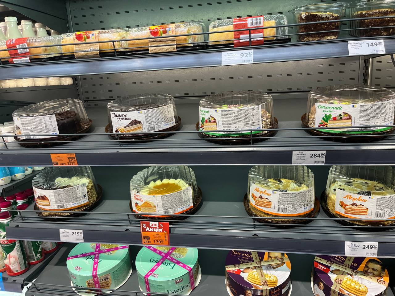 Супермаркет Варус также имеет отдельный большой холодильник с тортами на любой вкус и кошелек. Скидки здесь бывают также приятные, вплоть до -100 грн за торт. Также можно найти трендовый "дубайский" торт — для особых ценителей гастрономической моды.