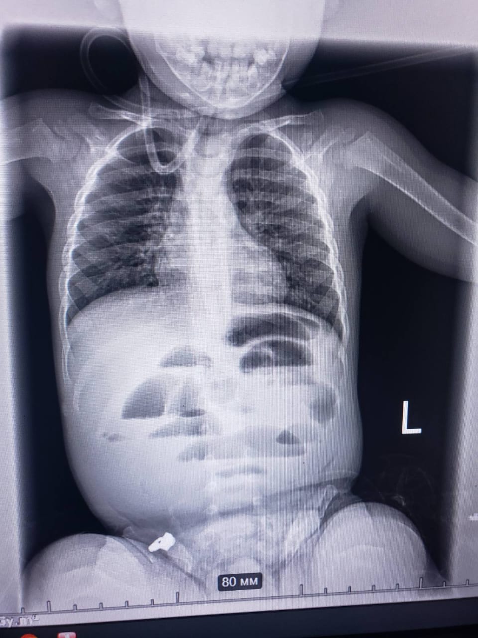 В Региональный медицинский центр семейного здоровья доставили ребенка возрастом 1 год 8 месяцев с подозрением на кишечную непроходимость. На рентгенограмме органов брюшной полости признаки непроходимости подтвердились.
