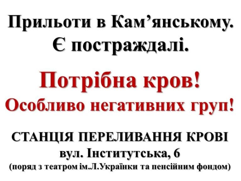 Днепропетровская областная станция переливания крови в Каменском сообщает: для пострадавших в результате ночного прилета срочно требуется кровь, особенно редких отрицательных групп. Все желающие могут обратиться на станцию переливания крови по адресу: ул. Институтская, 6 (рядом...