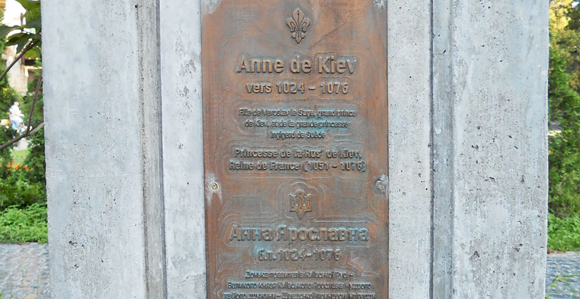 4.Тризуб зображений на могильній плиті доньки Ярослава Мудрого французької королеви Анни Ярославни (1032−1075), яка похована в церкві Вільєрського абатства, поблизу міста Етамп у Франції. Як відомо, золотий тризуб на синьому фоні був гербом Ярослава Мудрого.
