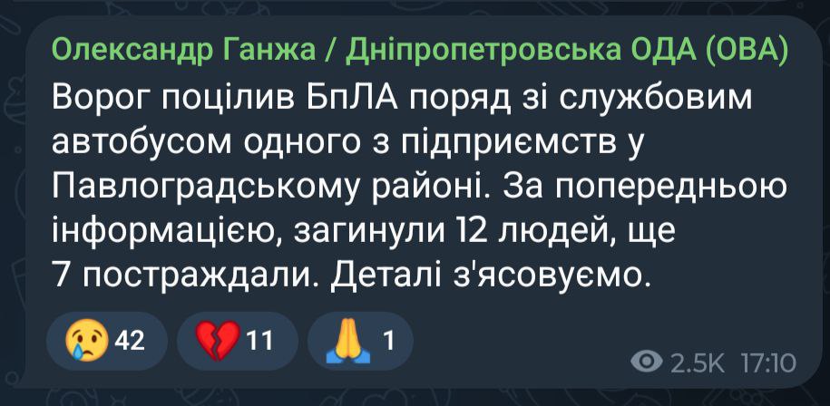 Сьогодні, 1 лютого, Павлоградський район став об’єктом чергової терористичної атаки ворога. За повідомленням голови Дніпропетровської ОДА Олександра Ганжі, безпілотник поцілив поряд зі службовим автобусом одного з підприємств. За попередніми даними, цей удар забрав життя 15 людей, ще семеро отримали поранення.