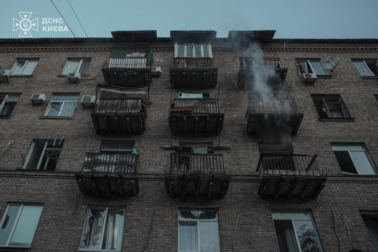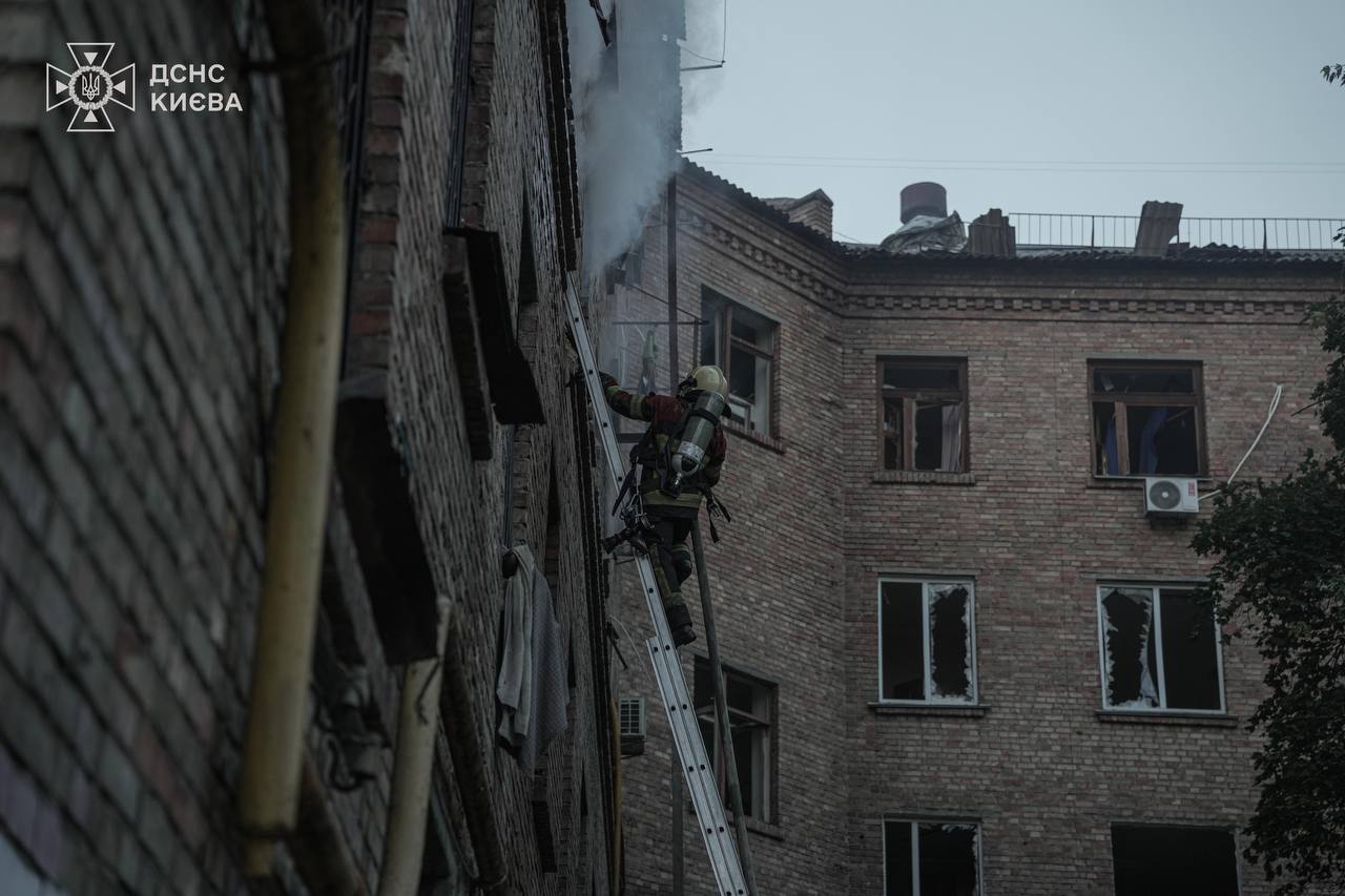 - Дарницький район. Внаслідок влучання БпЛА горіли поверхи з 11 по 16 у 17-поверхівці. Врятовано 15 людей, з них 2 дитини. Також горіла двоповерхова нежитлова будівля — пожежу локалізовано.